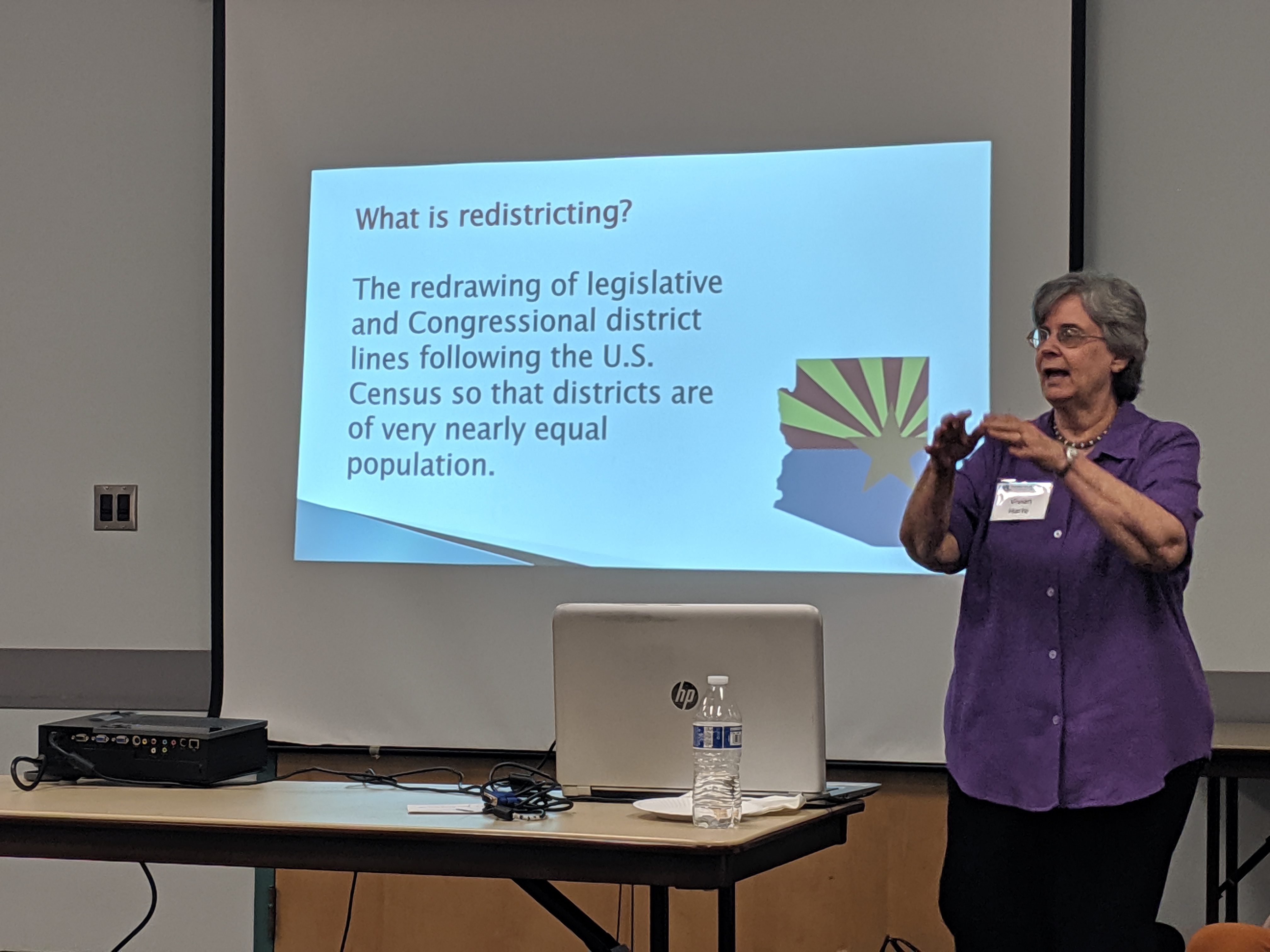 Sitting in card table chairs arranged in a half-circle, they fixed their attention at the open end at the south-side of the room and, more specifically, on president Vivian Harte as she rattled through her 30-minute power-point presentation on the future of redistricting in Arizona.