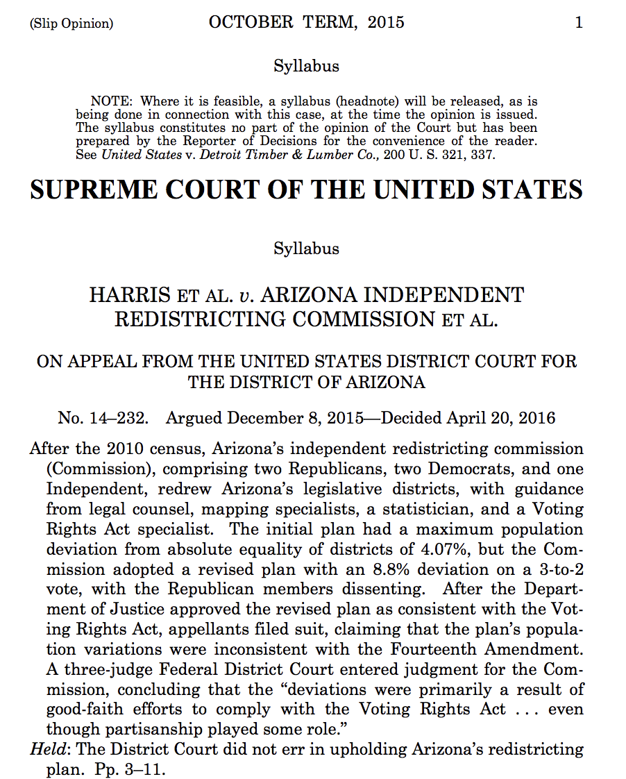 The U.S. Supreme Court ruled 5-4 in Arizona State Legislature v. Arizona Independent Redistricting Commission in favor of the commission, confirming its constitutionality − as well as the constitutionality of other state’s independent commissions.