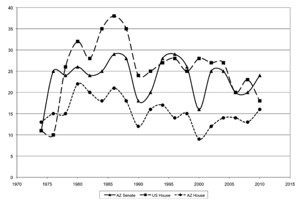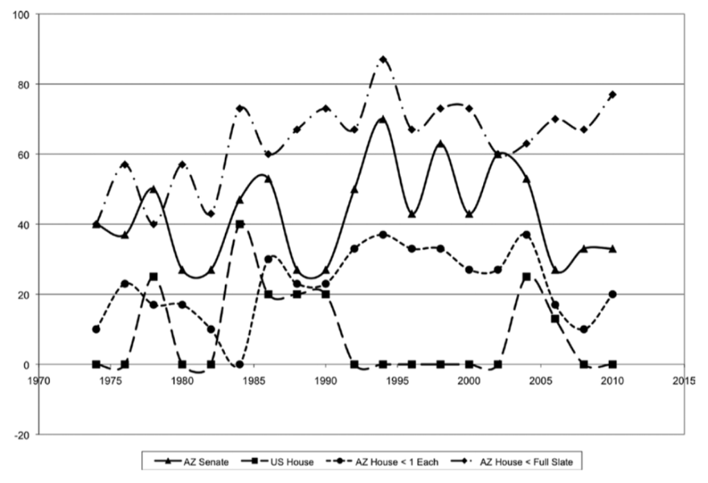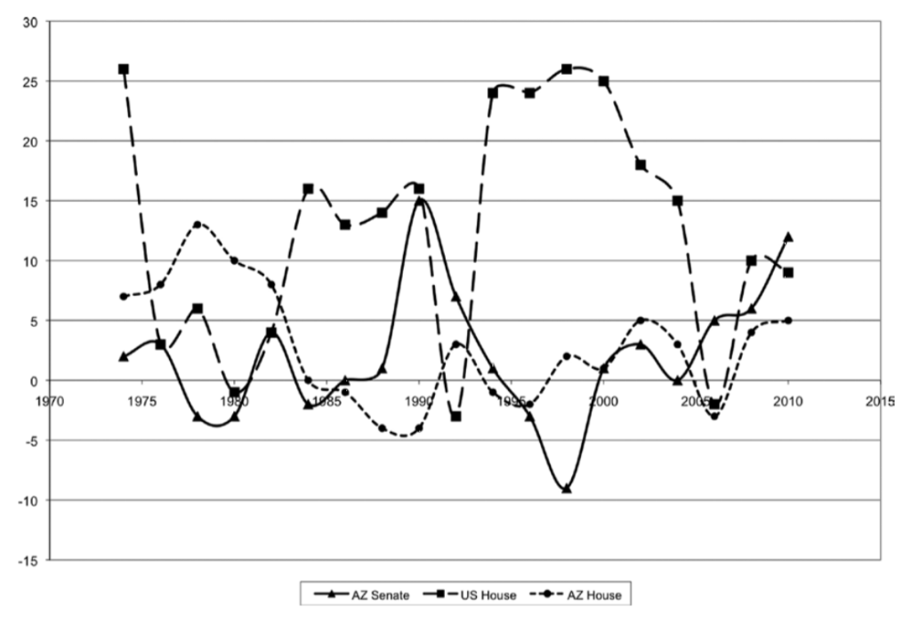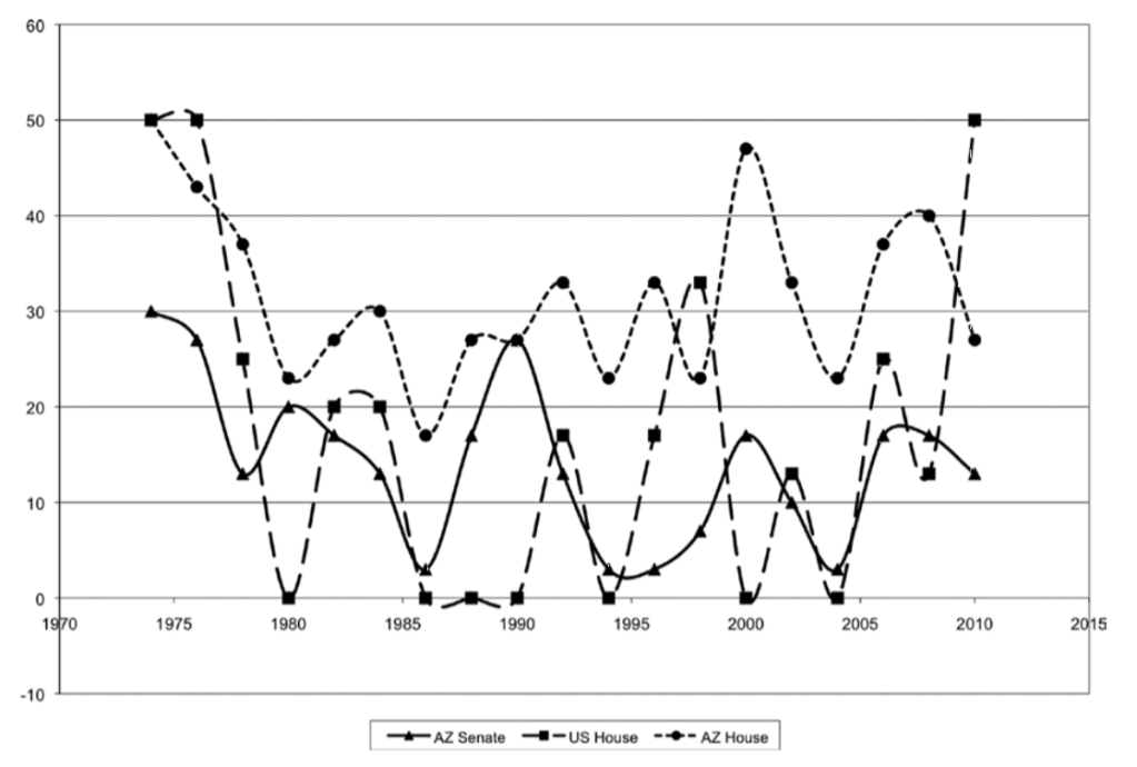 More specifically, she evaluated four components of the U.S. House, and Arizona state house and senate elections: the percentage of races that were unopposed, the winning margin for races with two major-party candidates, the percent of races with a winning margin of 10 percentage points or less, and the majority party vote-seat bias.