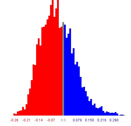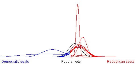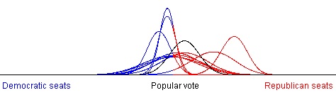 A glance at a district outcome probability curve (at left) shows that most districts in most elections lean slightly Republican based on a simulation of 100,000 elections. But the likelihood of an extreme gerrymander is about the same for both parties.